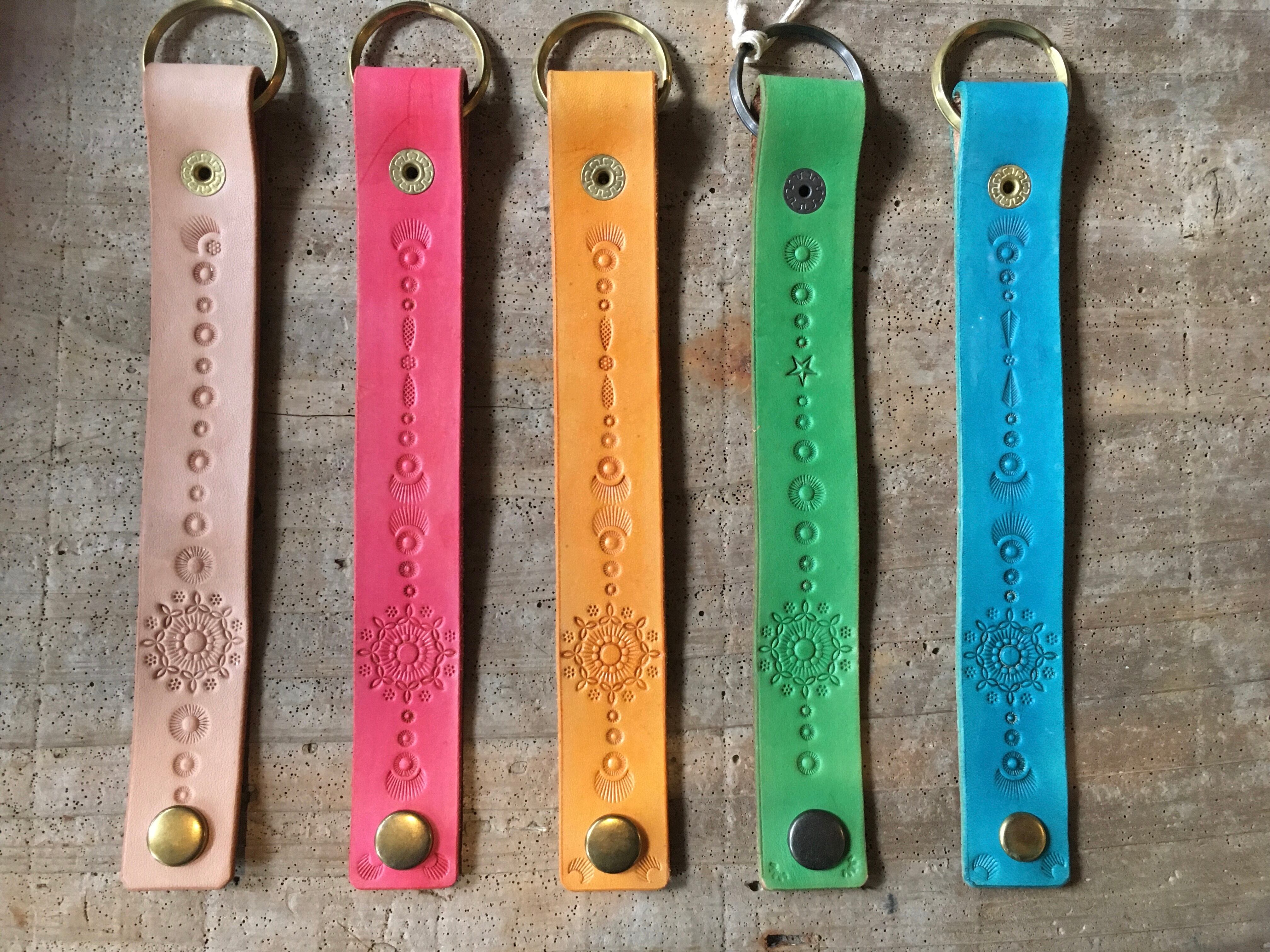 手染めのヌメ革に、繊細な曼荼羅模様を一つ一つ刻印した、シンプルなキーリングです。