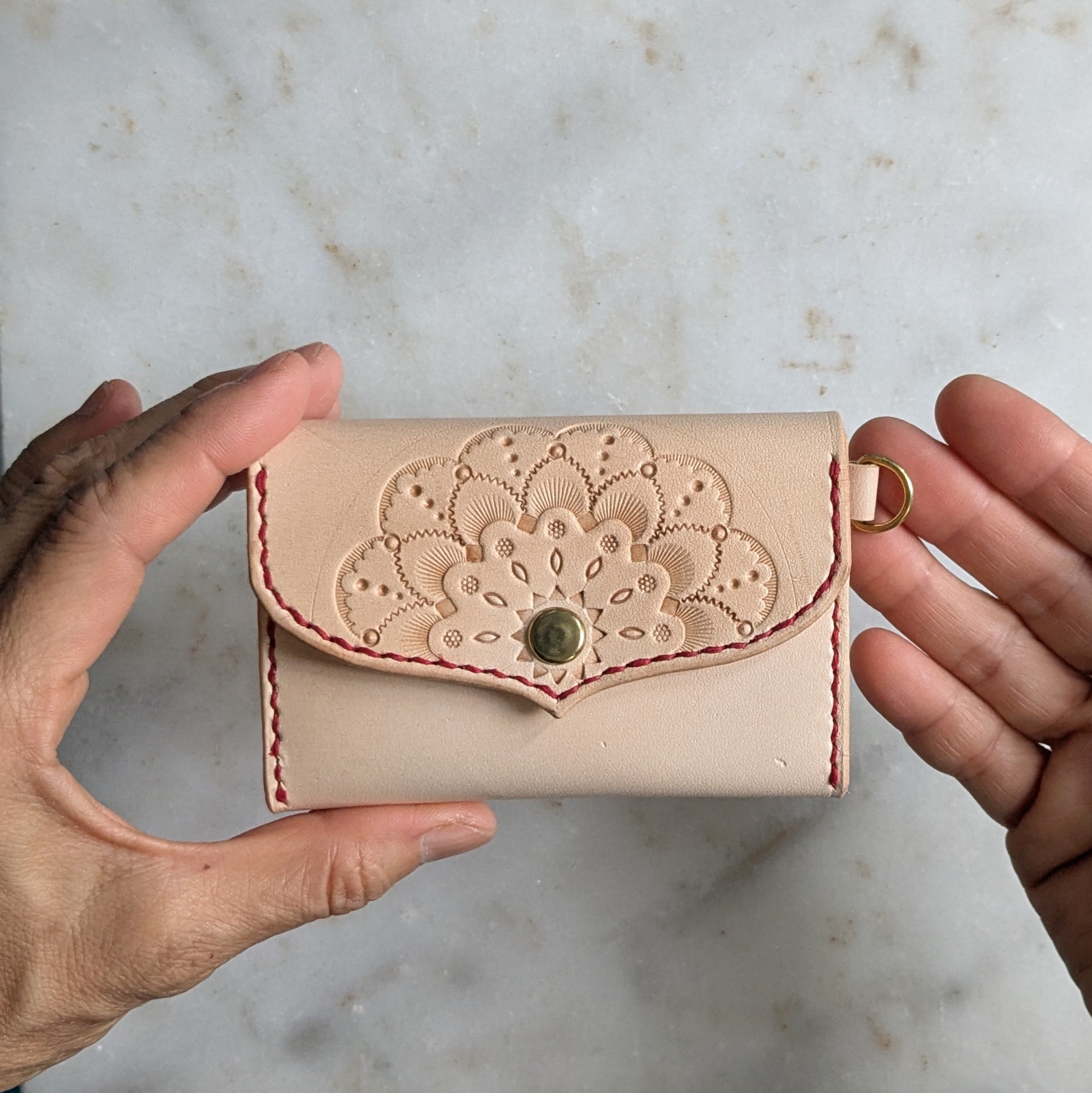 手染めのヌメ革に、ひとつひとつ刻まれた曼荼羅模様。