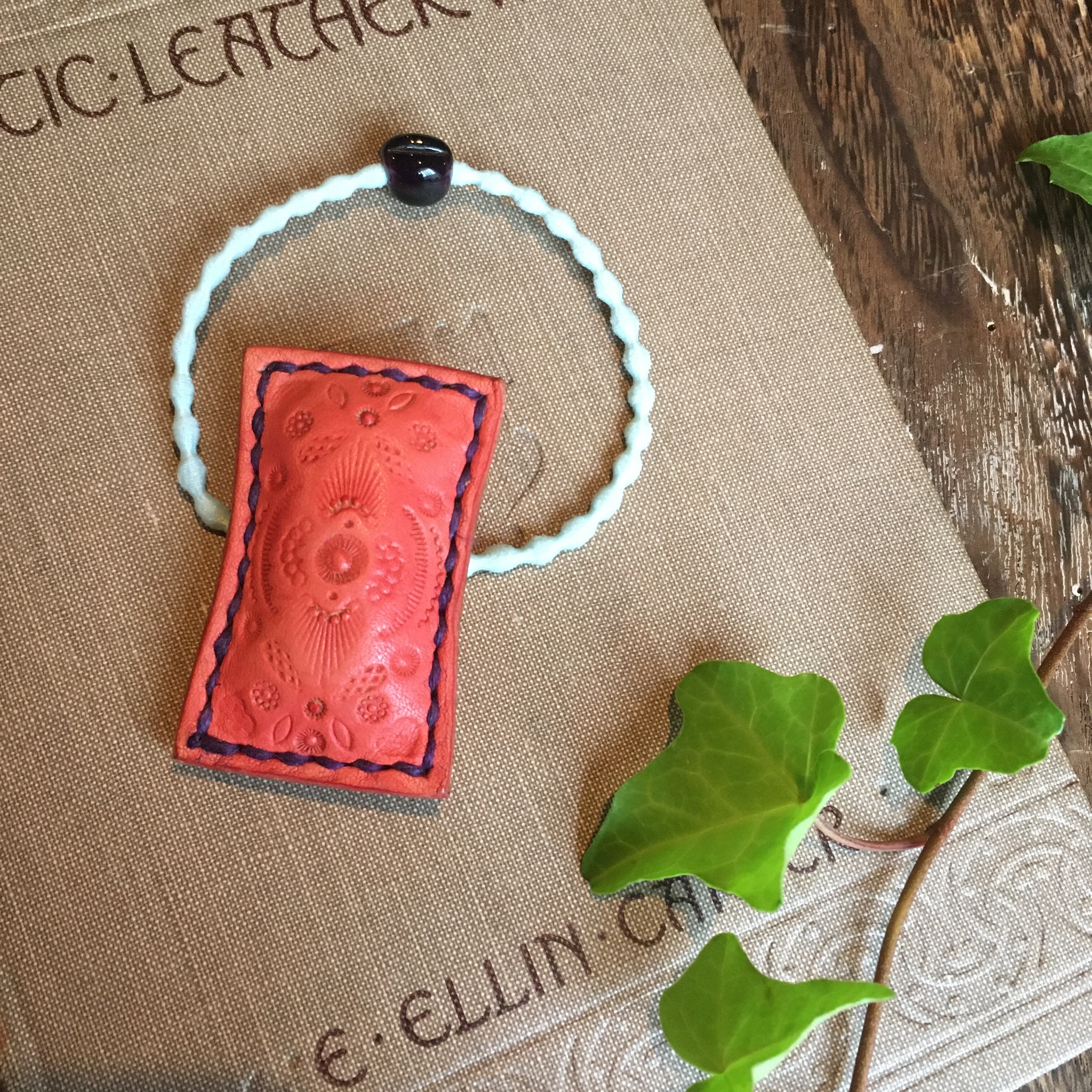 牛ヌメ革に曼荼羅模様を一つ一つ刻印し、中には綿を詰めて立体感を出しました。