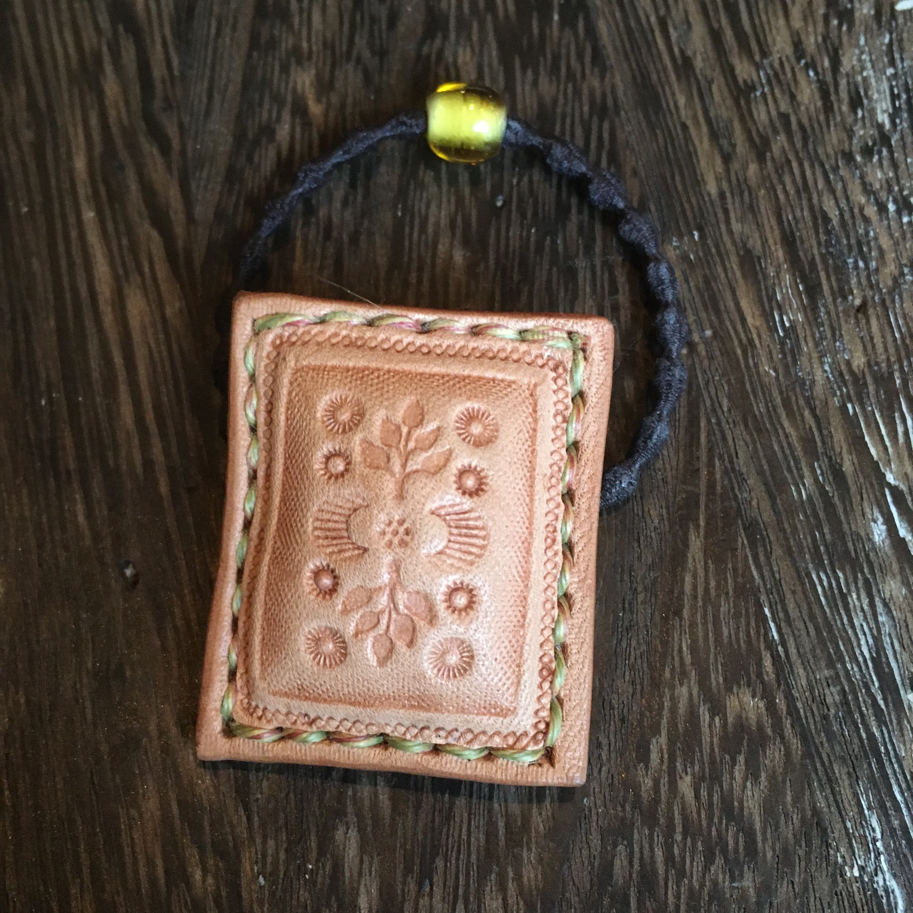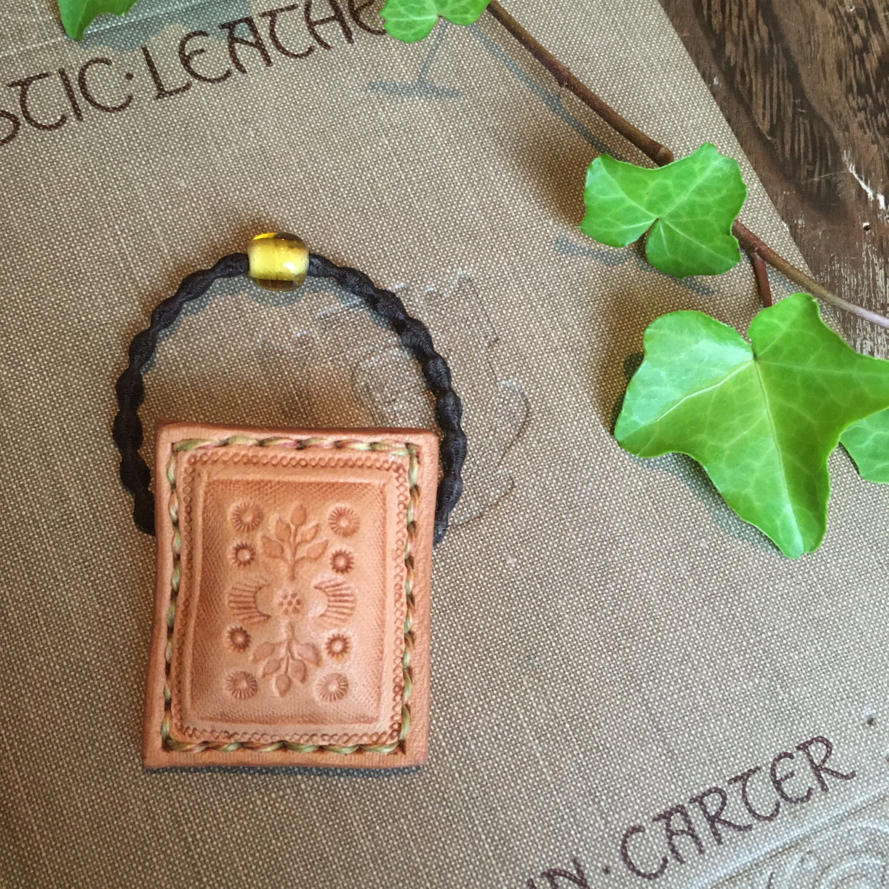 牛ヌメ革に曼荼羅模様を一つ一つ刻印し、中には綿を詰めて立体感を出しました。