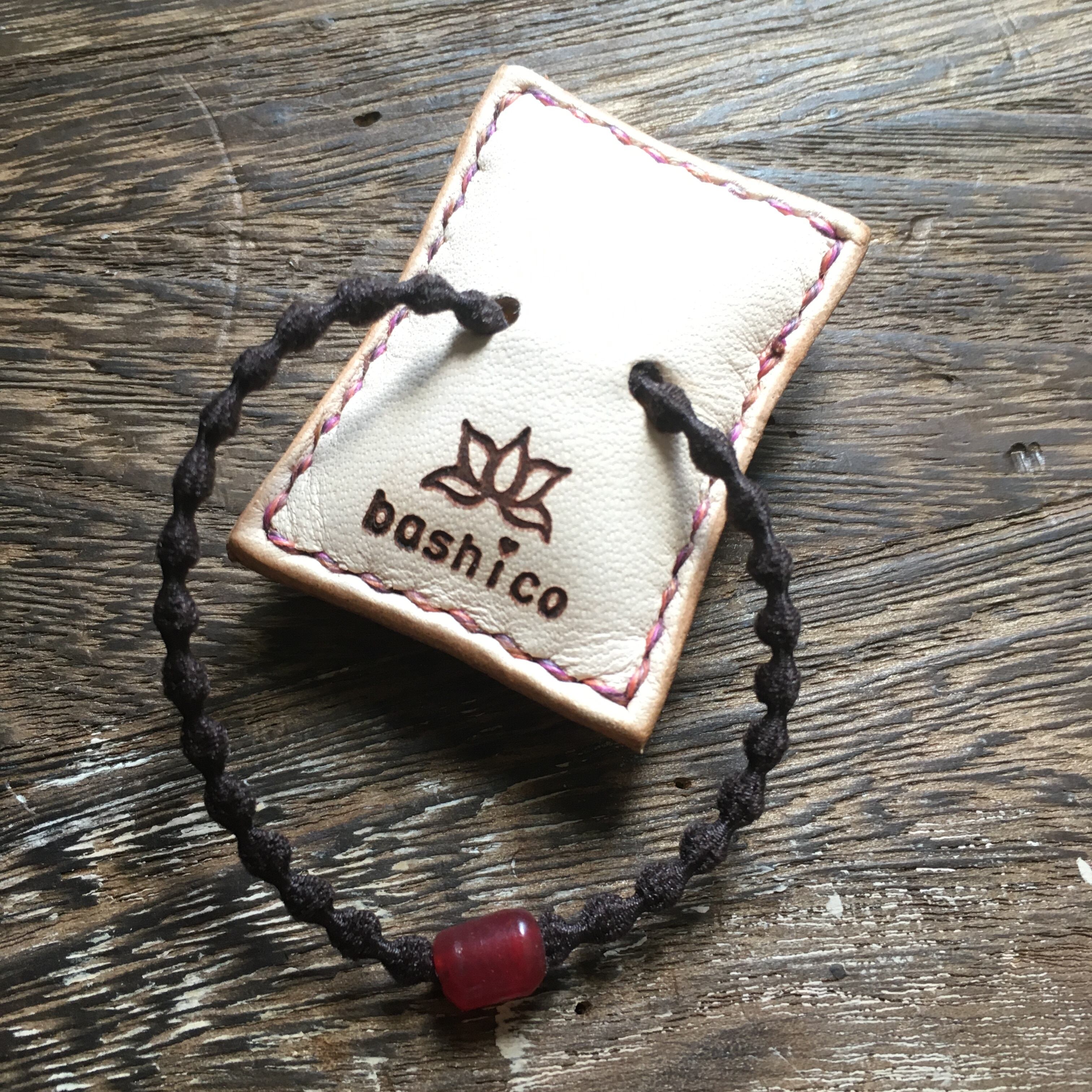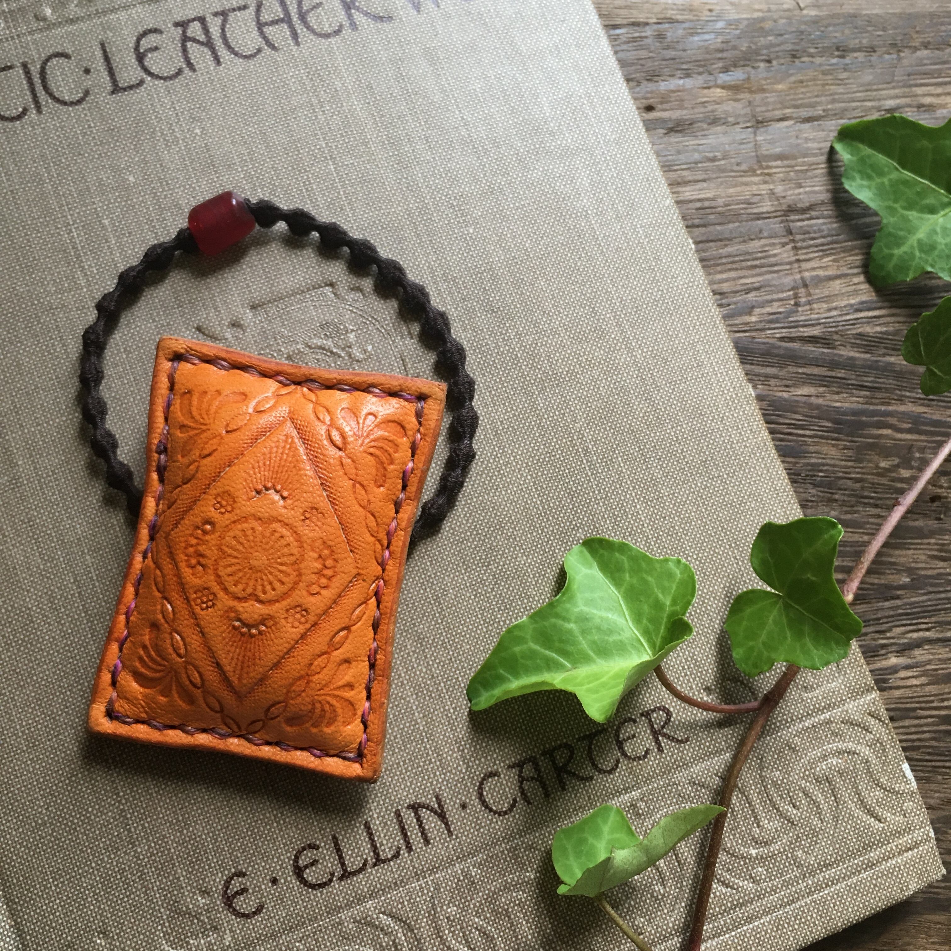 テラコッタオレンジに染色した牛ヌメ革に曼荼羅模様を一つ一つ刻印し、中には綿を詰めて立体感を出しました。