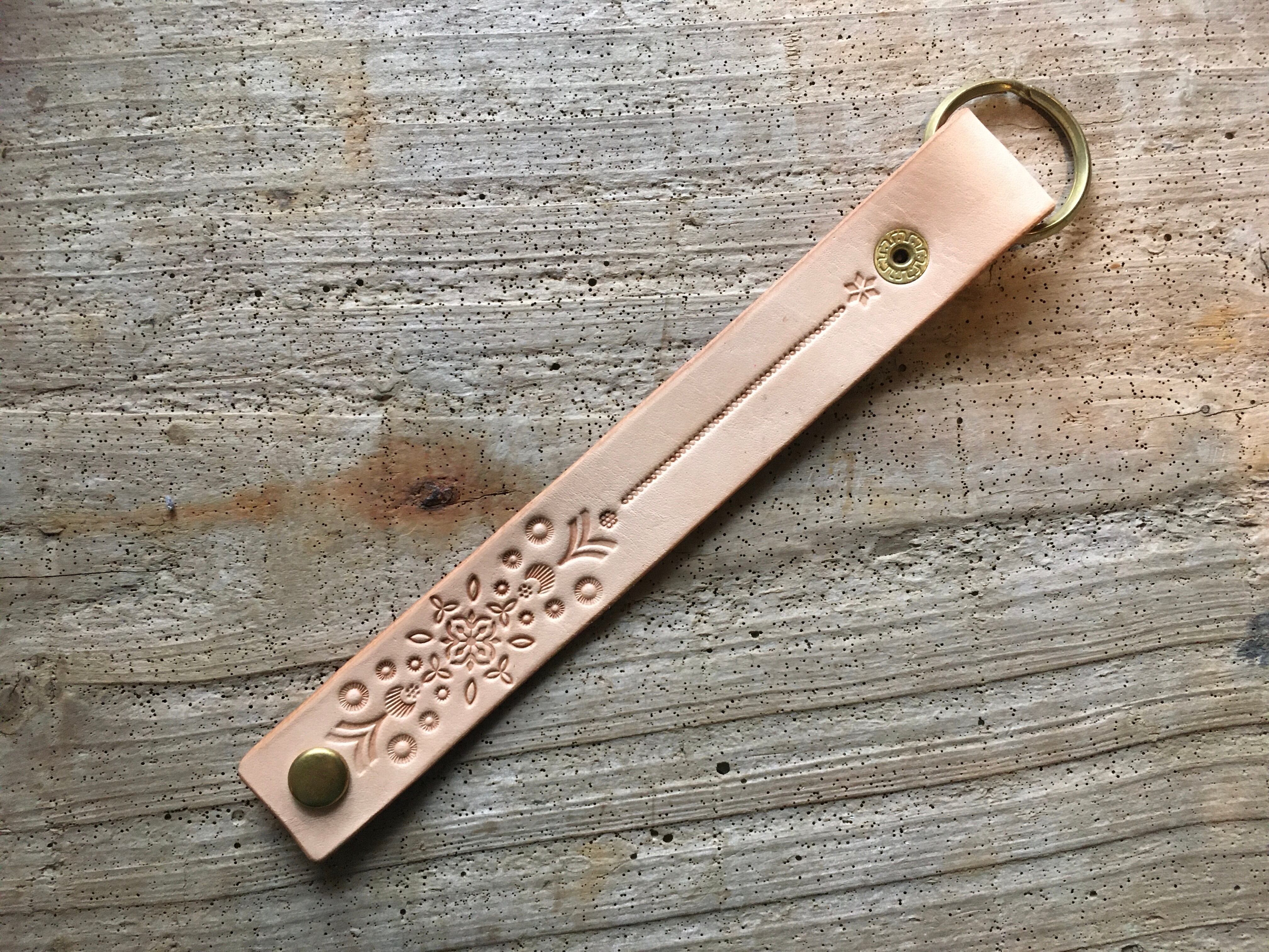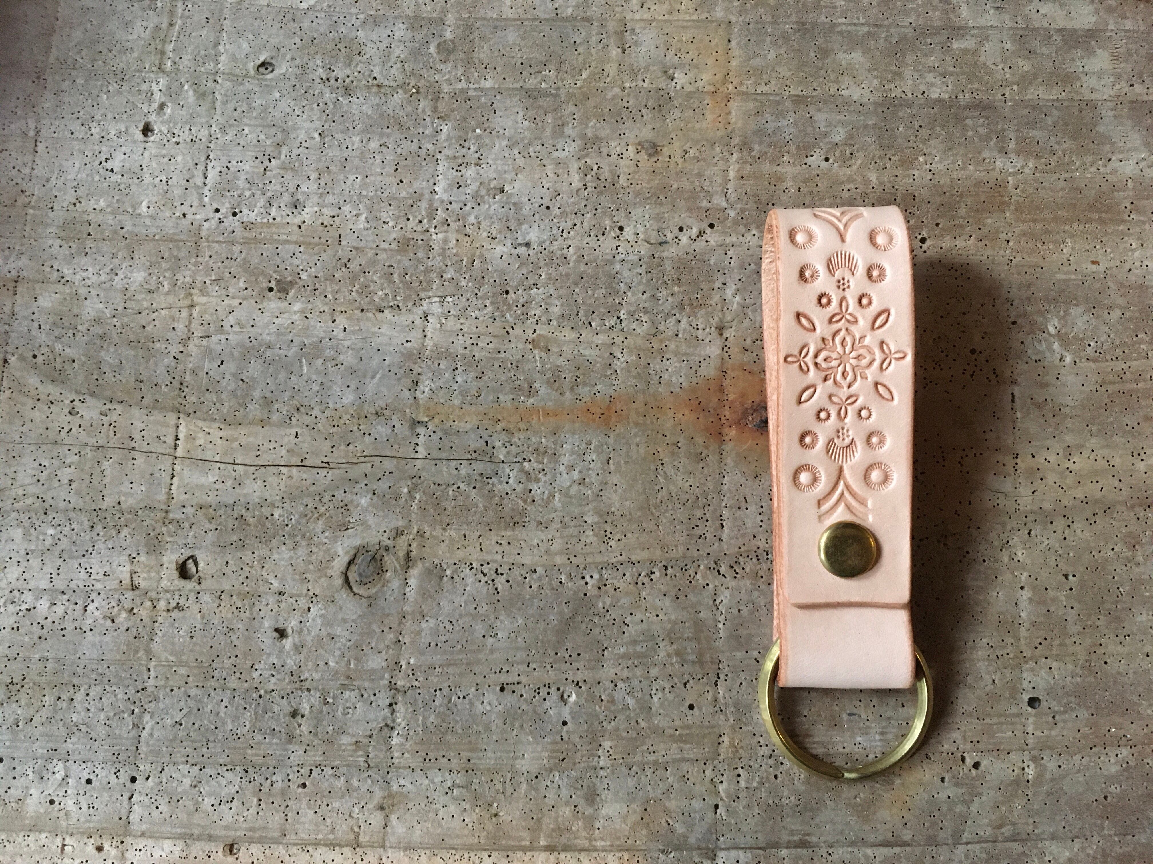 手染めのヌメ革に、繊細な模様を一つ一つ刻印した、シンプルなキーリングです。